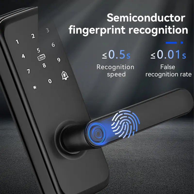 Equipado com um sensor de impressão digital semicondutor e um chip de algoritmo independente, este Smart Deadbolt se adapta às alterações de impressão digital para desbloqueio com um toque. O sensor está integrado na alça: travas de pressão para cima, desbloqueios de pressão para baixo, adaptando-se aos hábitos diários.